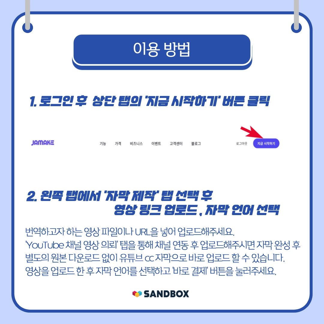 샌드박스와 업무제휴를 맺은 '자메이크'를 통해 번역자막 서비스를 이용하실 경우, 샌드박스 크리에이터 전용 특별할인 및 후불 결제를 통한 간편 정산 프로세스까지 누리실 수 있습니다.