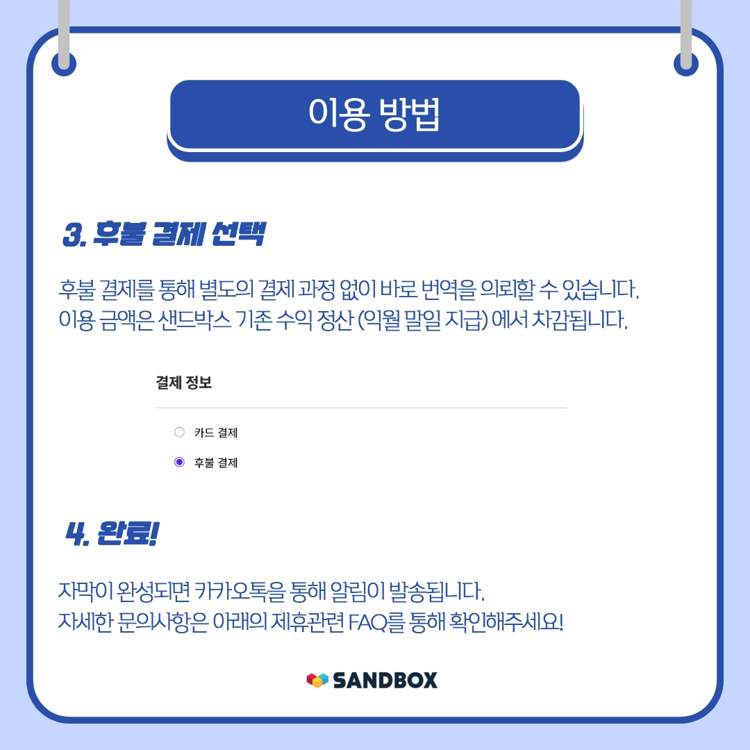 둘, 편리한 정산 - 샌드박스의 기족 수익 정산(익월 말일 지급)에서 차감